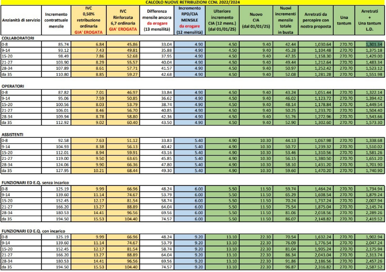 Gli incrementi stipendiali previsti dal rinnovo variano in base al profilo professionale e all’anzianità di servizio, suddivisa in diverse fasce di esperienza (0-8, 9-14, fino a oltre 35 anni).